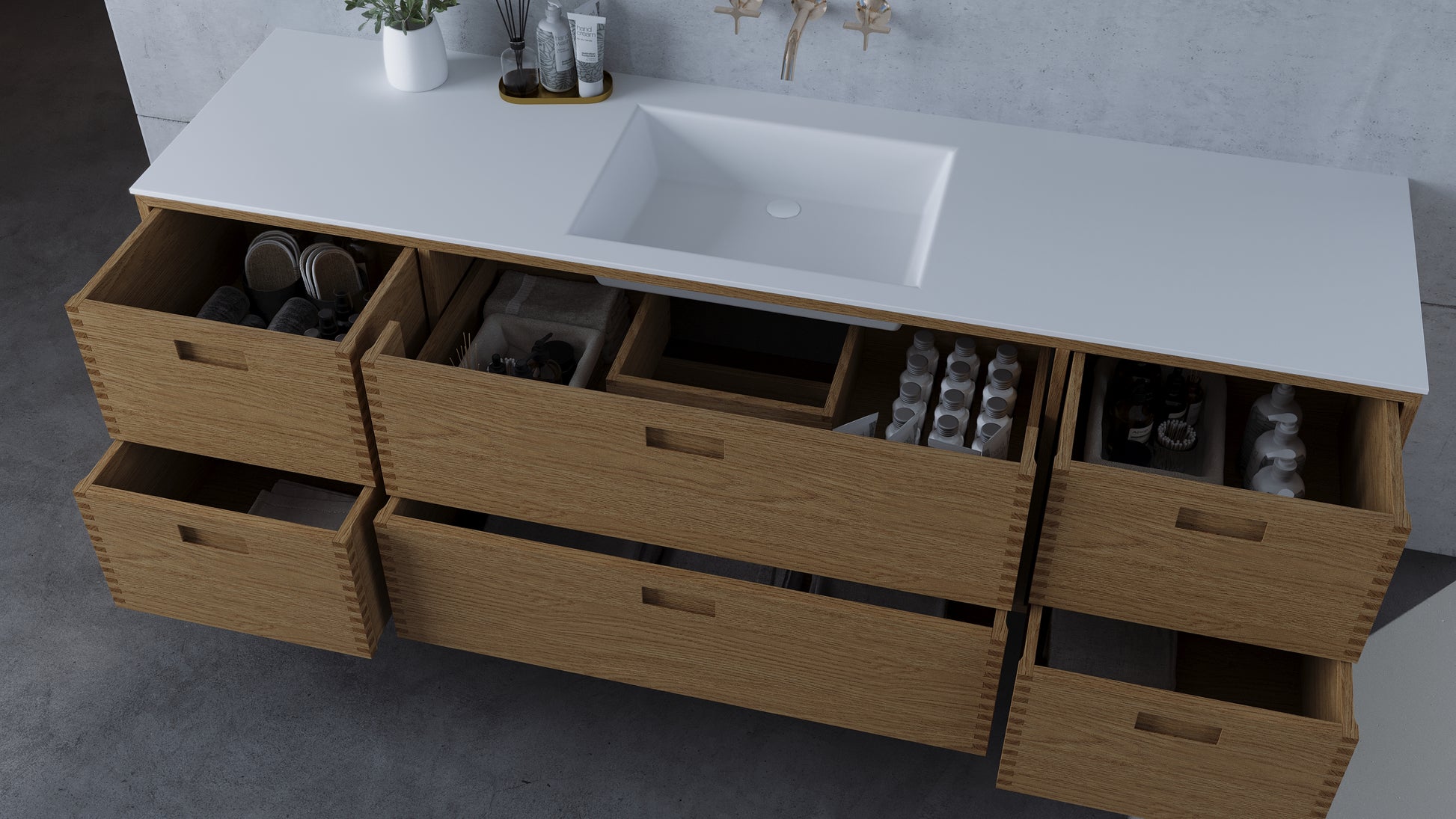 • Drawers: Several spacious drawers, depending on the size chosen, equipped with full extension and soft-close function for quiet and smooth operation. The larger the size, the more drawers.