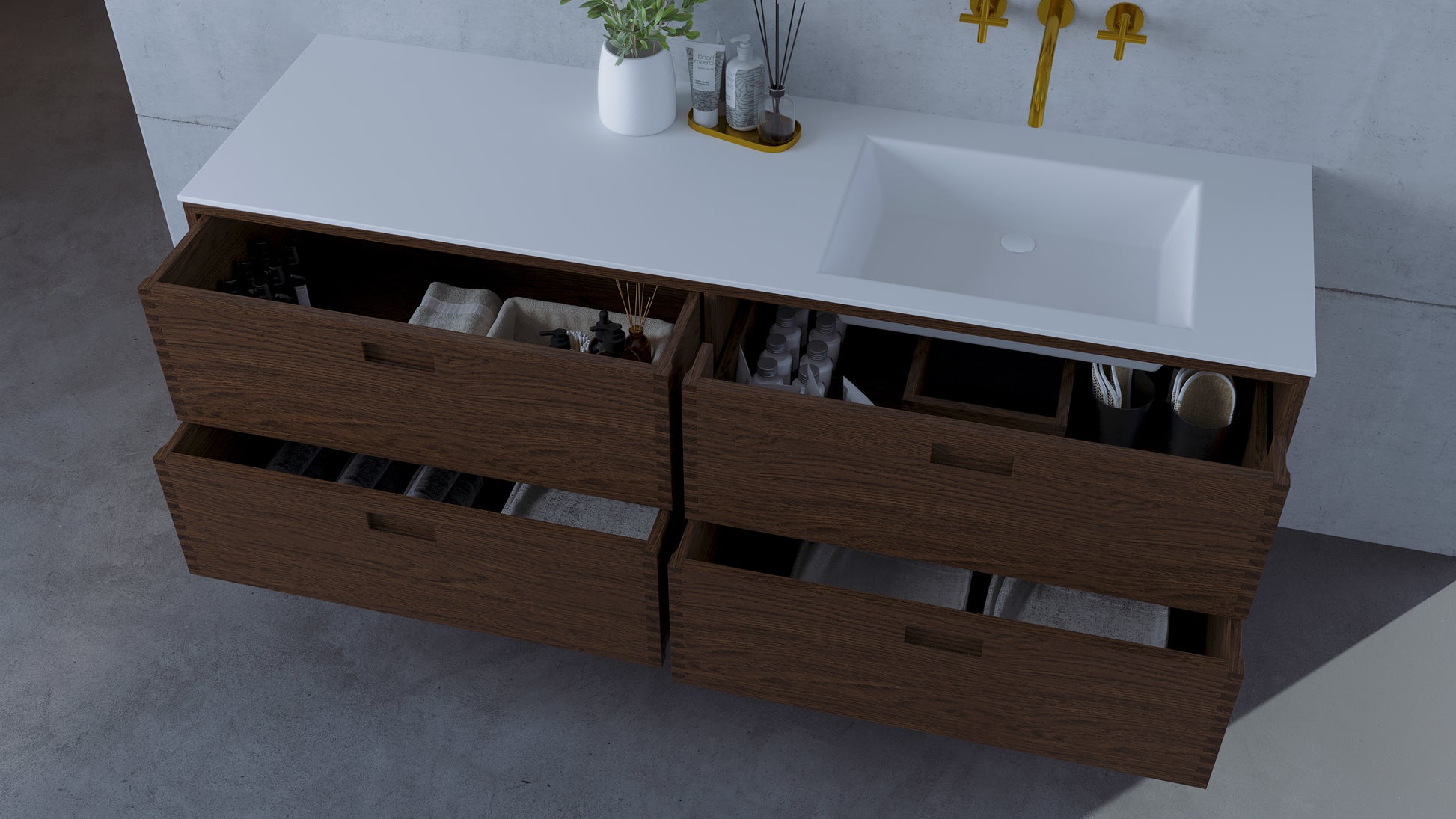 • Drawers: Several spacious drawers, depending on the size chosen, equipped with full extension and soft-close function for quiet and smooth operation. The larger the size, the more drawers.