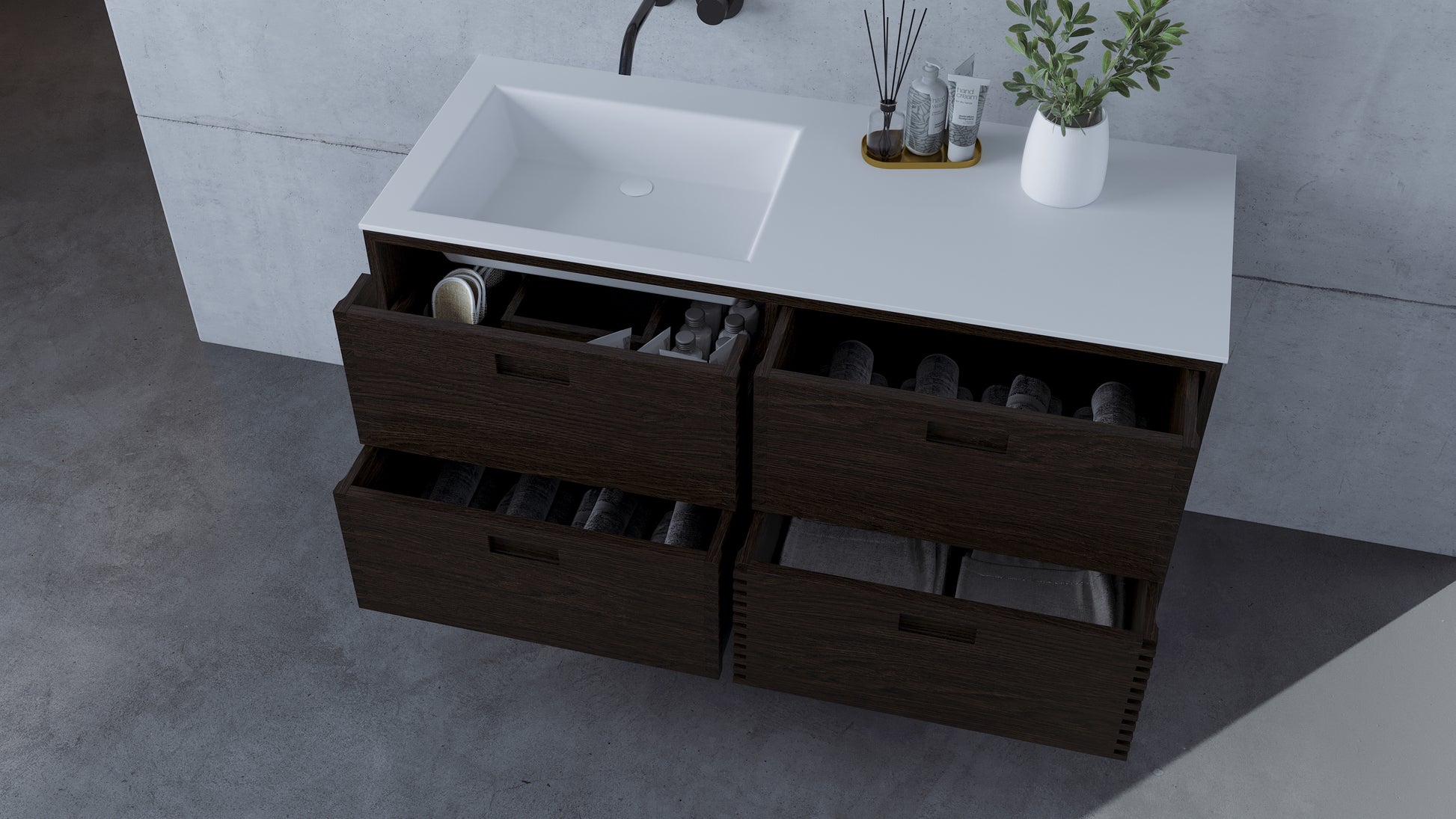 • Drawers: Several spacious drawers, depending on the size chosen, equipped with full extension and soft-close function for quiet and smooth operation. The larger the size, the more drawers.