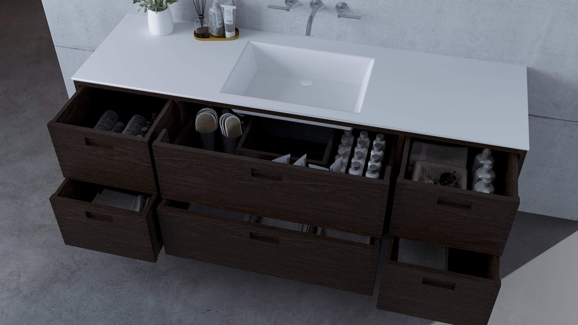 • Drawers: Several spacious drawers, depending on the size chosen, equipped with full extension and soft-close function for quiet and smooth operation. The larger the size, the more drawers.
