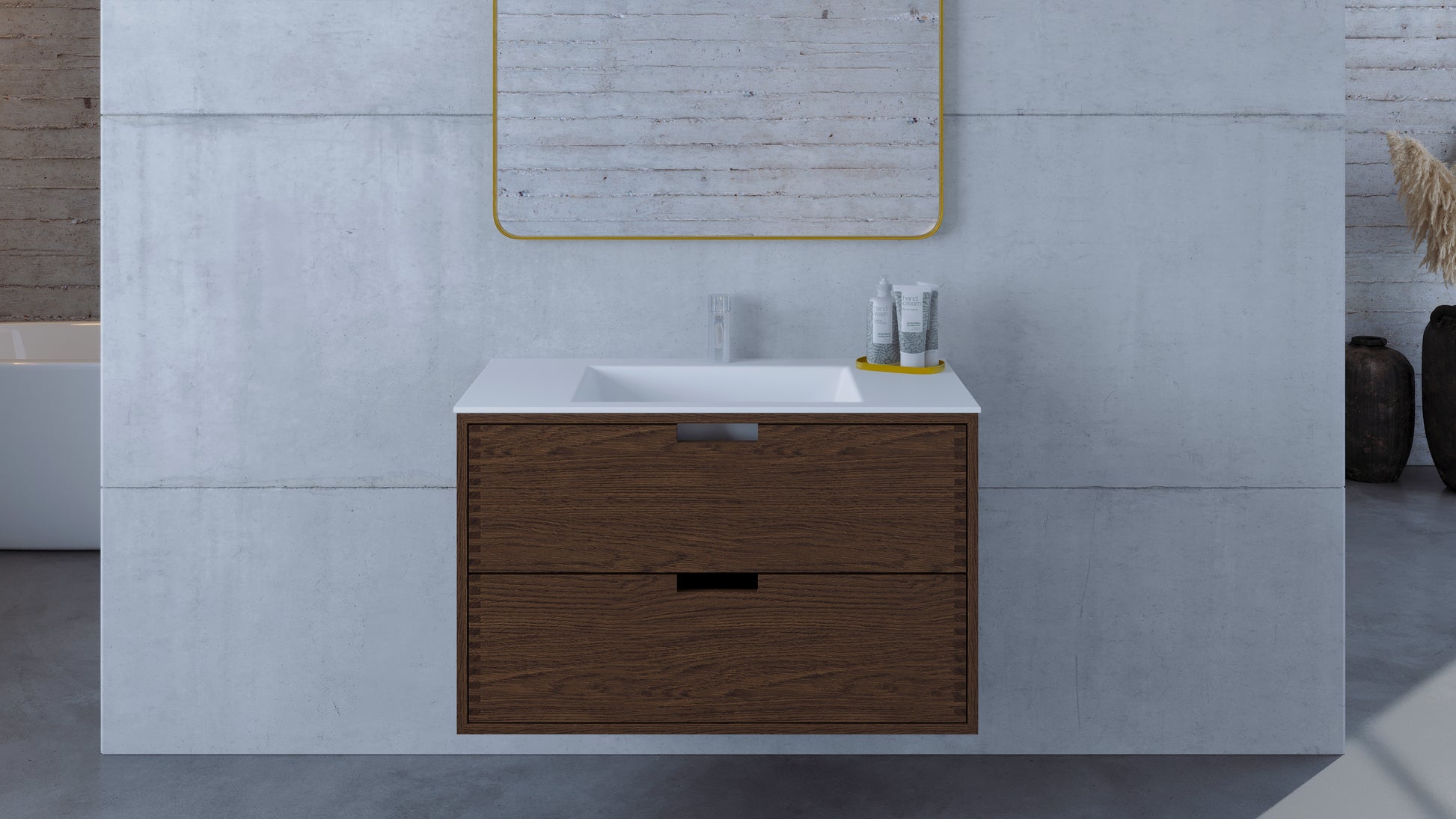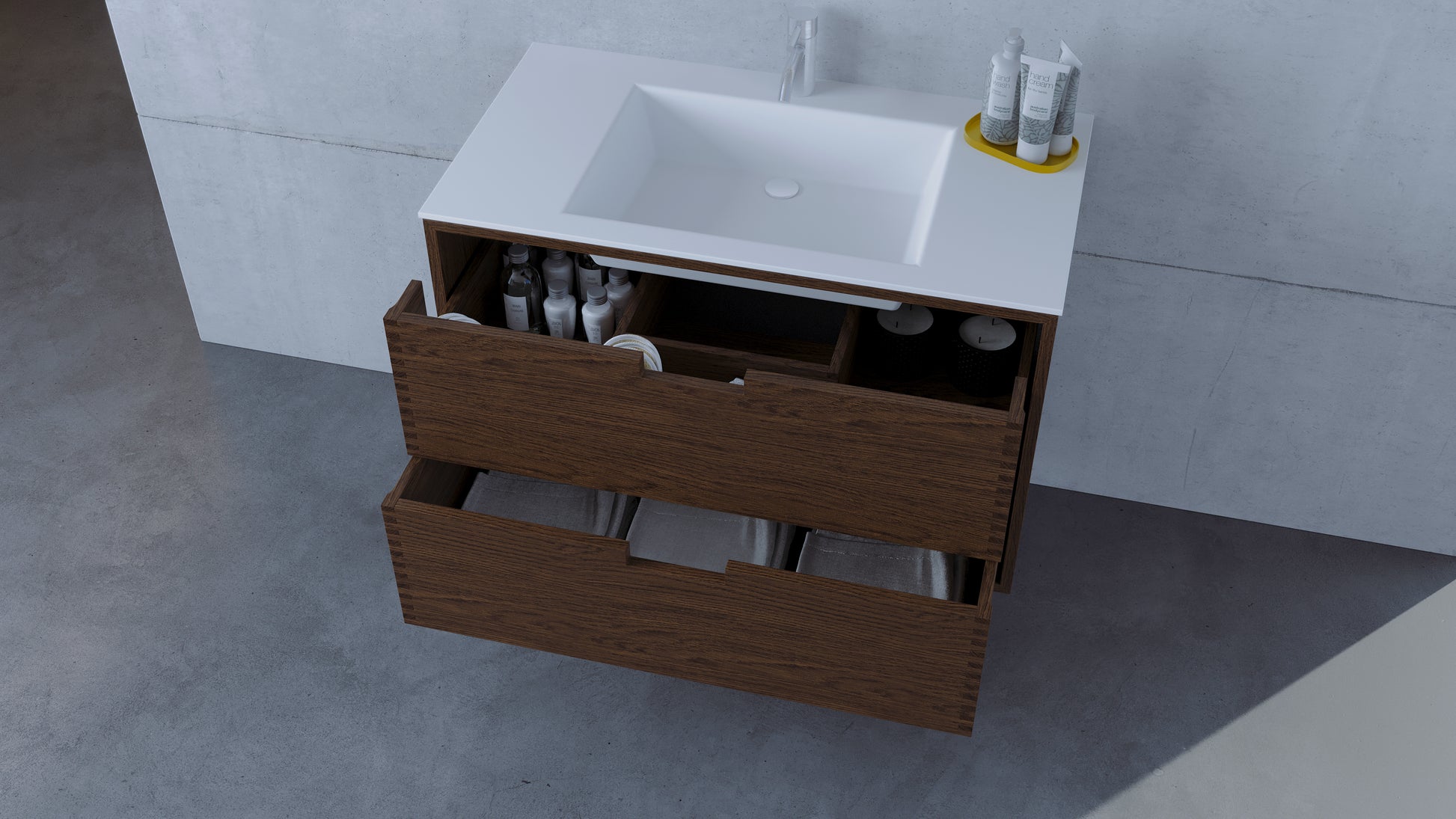 • Material: Solid oak, oiled to highlight the natural beauty and character of the wood. The sink is white solid surface.