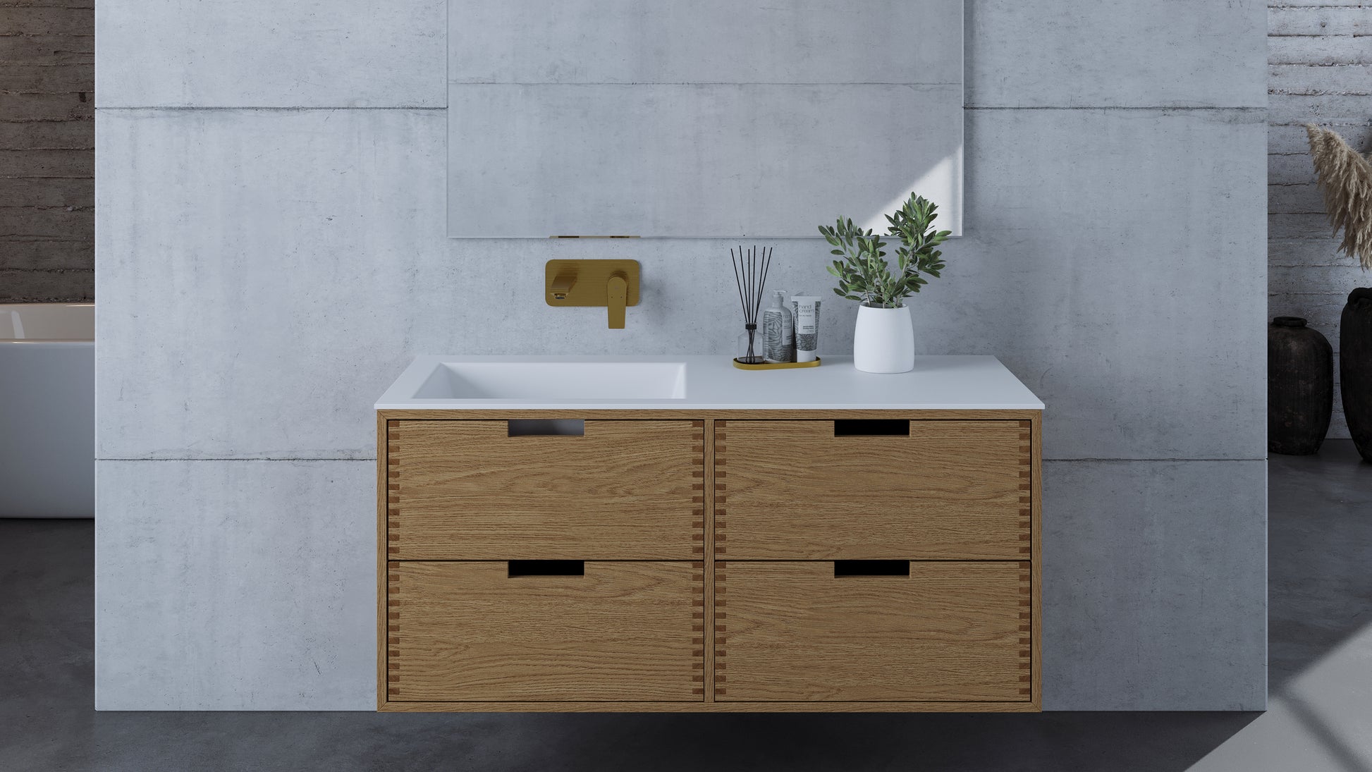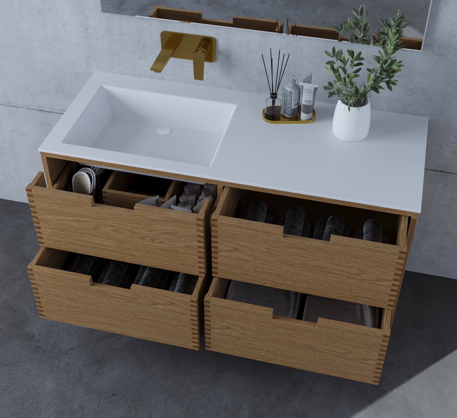 • Material: Solid oak, oiled to highlight the natural beauty and character of the wood. The sink is white solid surface.