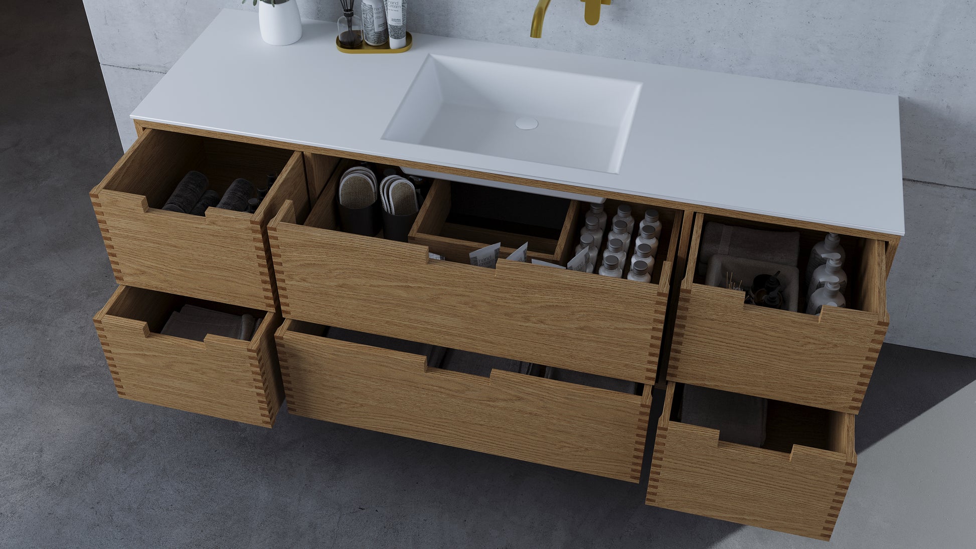• Material: Solid oak, oiled to highlight the natural beauty and character of the wood. The sink is white solid surface.