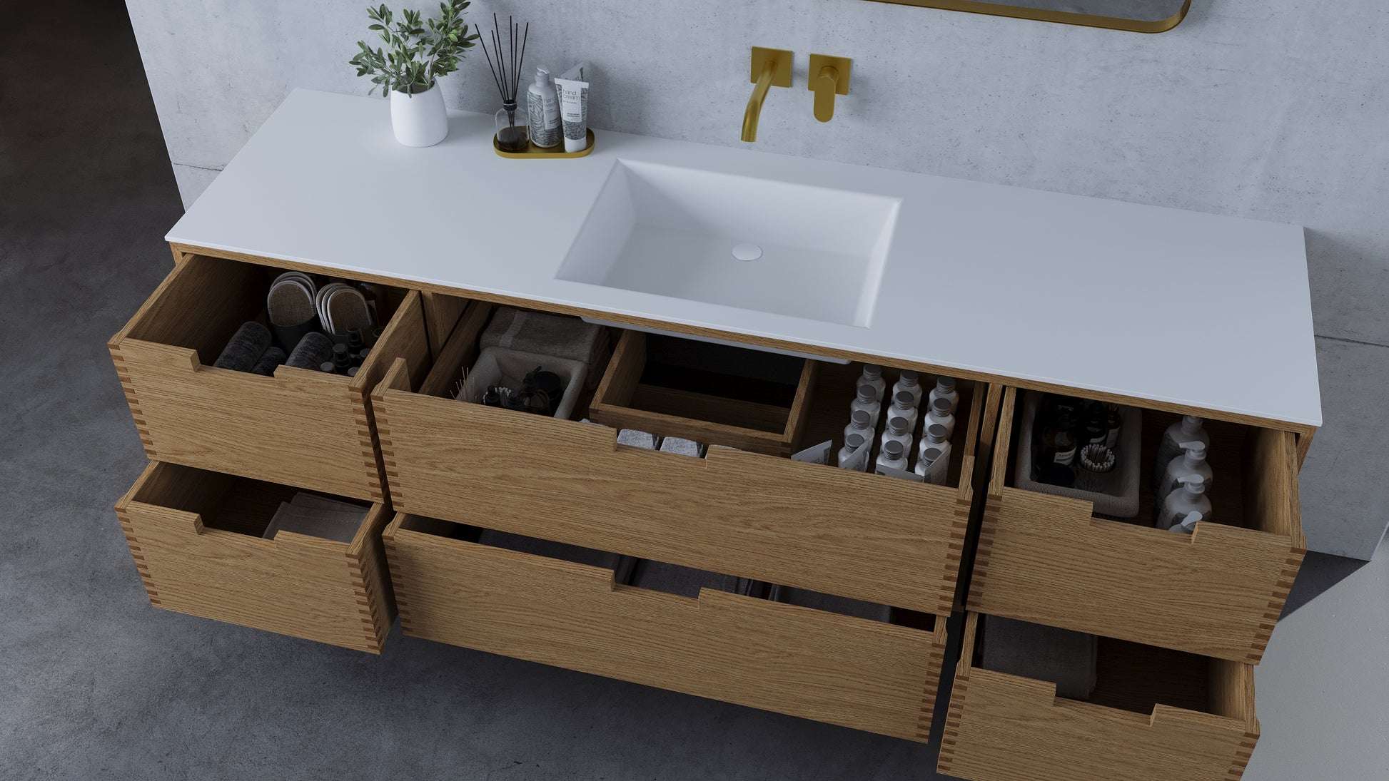 • Material: Solid oak, oiled to highlight the natural beauty and character of the wood. The sink is white solid surface.