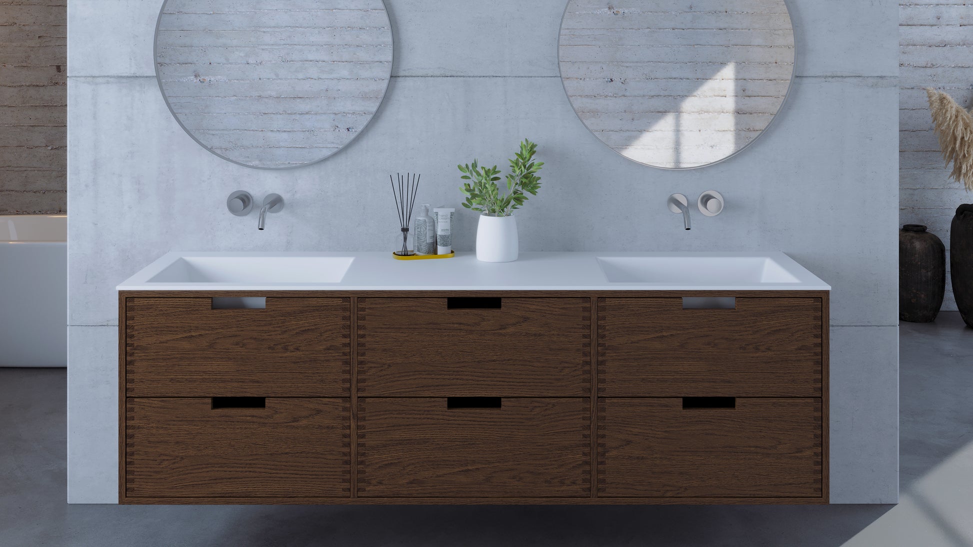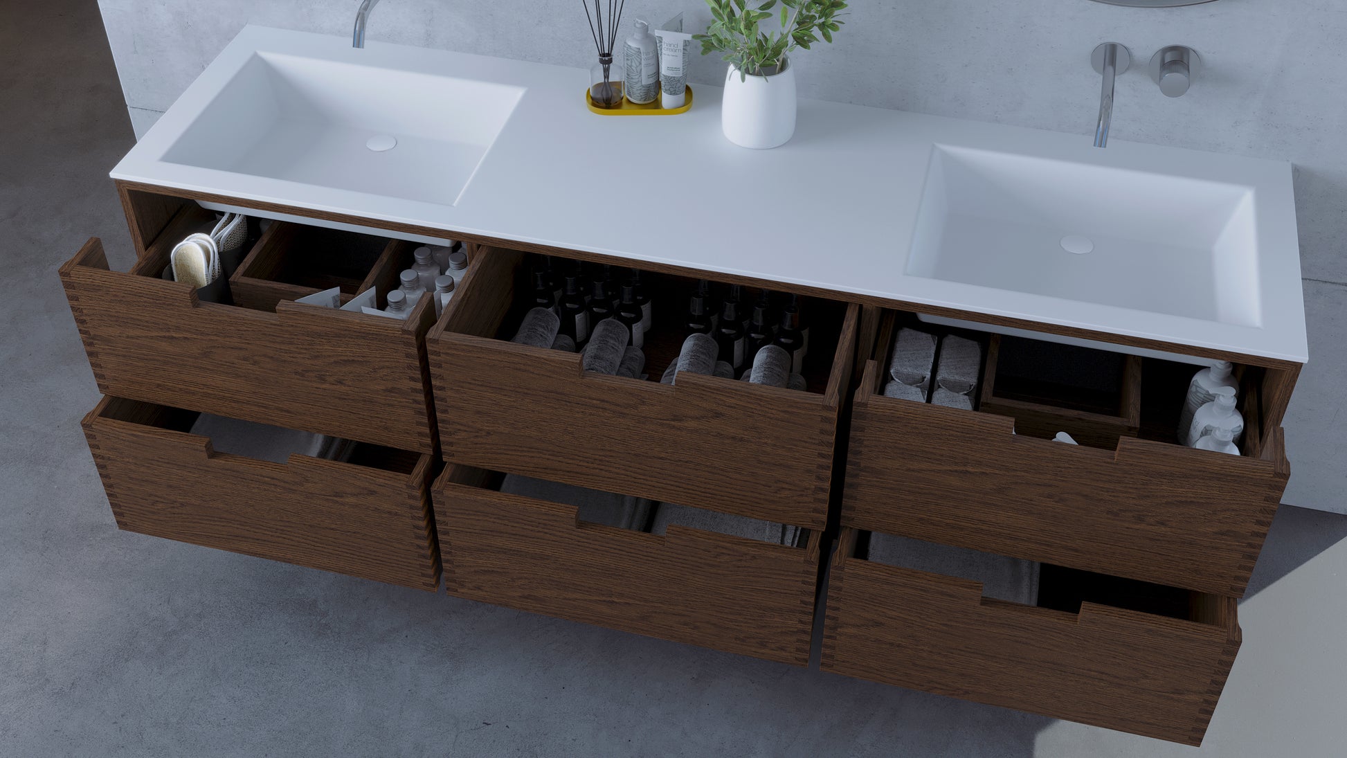 • Material: Solid oak, oiled to highlight the natural beauty and character of the wood. The sink is white solid surface.