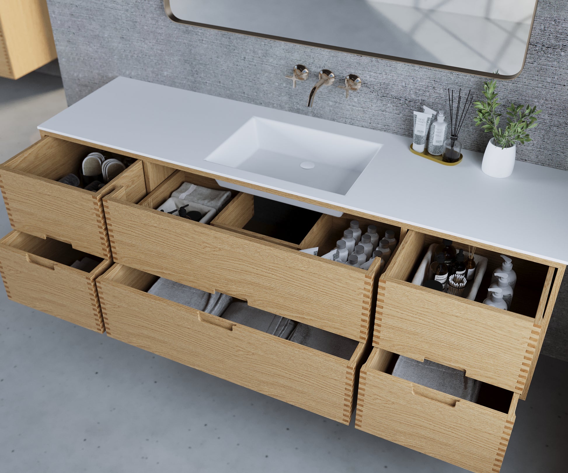 • Drawers: Spacious drawers that provide ample storage space. The drawers are equipped with full extension and soft-close function for quiet and smooth operation.