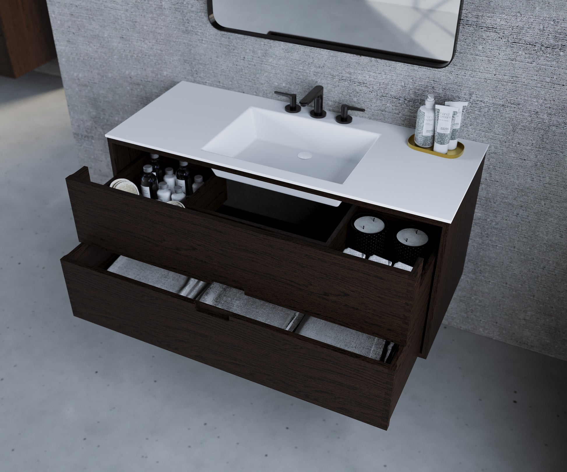 • Drawers: Spacious drawers that provide ample storage space. The drawers are equipped with full extension and soft-close function for quiet and smooth operation.