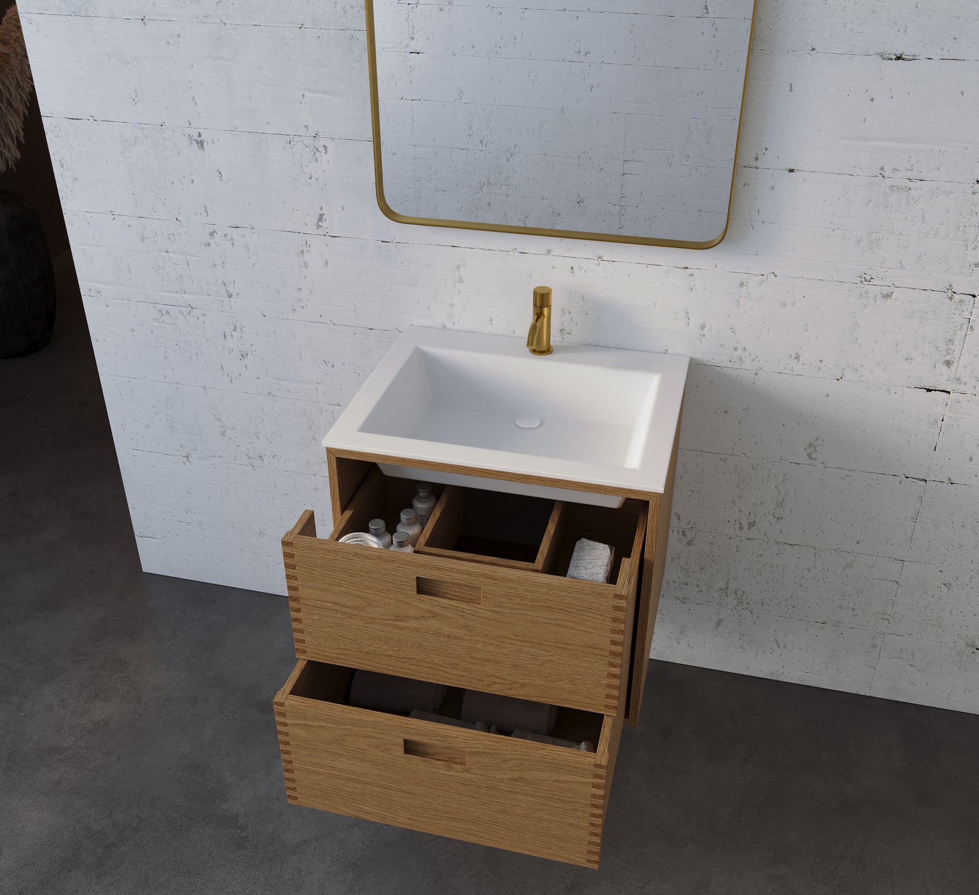 - Materiale: Massivt egetræ, olieret for at fremhæve træets naturlige skønhed og karakter. Bordpladen er hvis solid surface.